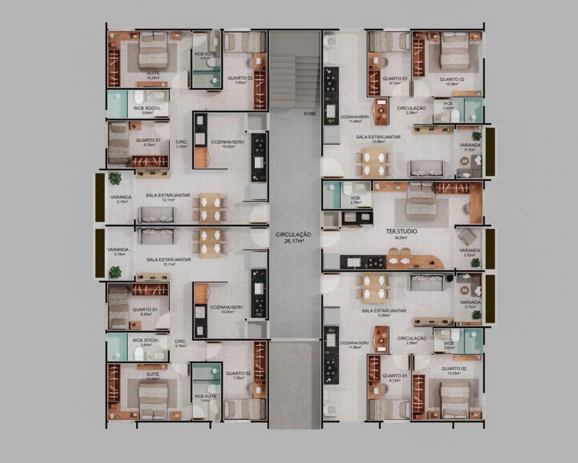 • Aptos 2 quartos (com ou sem suíte) – 56 m²